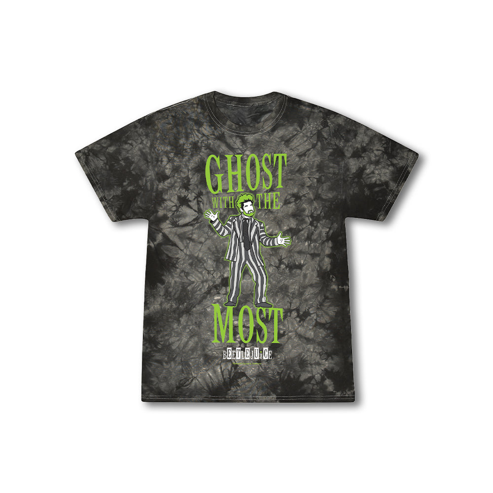 Give the fright of your life with this tee featuring everyone's favorite bio-exorcist from the netherworld, along with the quote, "The ghost with the most," and the Beetlejuice: The Musical logo.