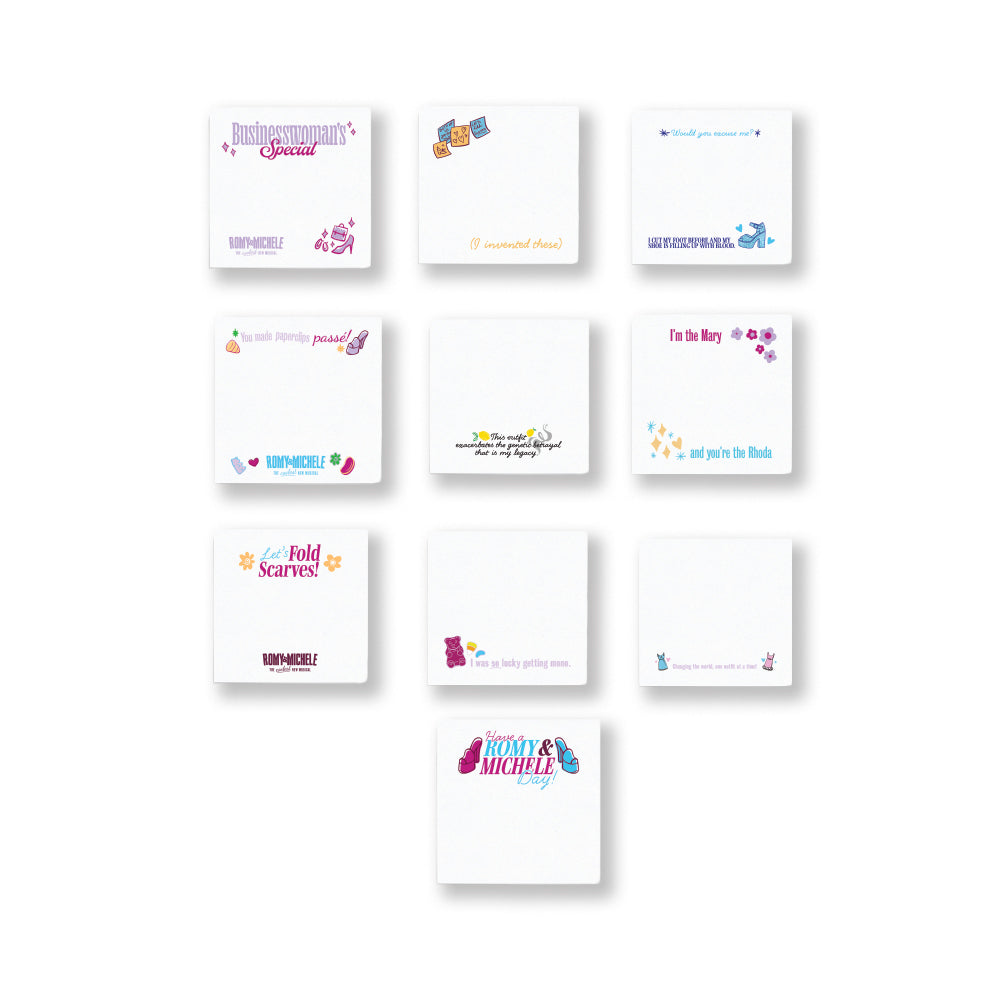 Display this sticky note pad featuring iconic moments from Romy and Michele: The Musical with pride. You did invent them after all.